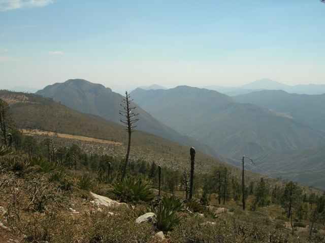 Desde los hombros de El Coahuilón, se divisan hacia el sureste de izquierda a derecha: el Picacho La Veleta, los llanos de La Pinta, la Sierra La Cuesta, y lejano el Cerro El Potosí. Anterior Fotografía: © Bernardo Marino Siguiente