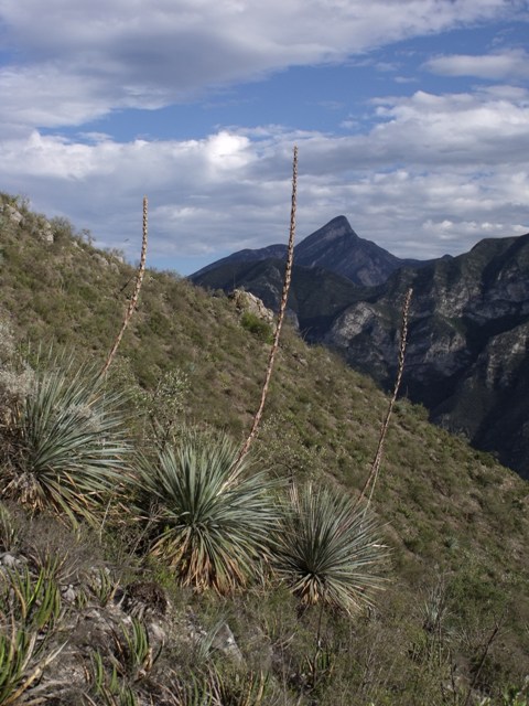Sotoles de la especie Dasylirion berlandieri. Detrás, el imponente Picacho El Orégano o Aguiluchos del Sur. Anterior Fotografía: © Bernardo Marino Siguiente